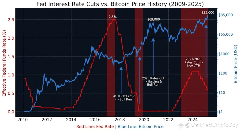 A rate cut matters because it lowers the "Cost of Capital." Lower rates reduce yields on risk-free Treasuries, forcing capital further out on the risk curve into crypto. Additionally, a rate cut typically weakens the dollar (DXY), mathematically pushing up the price of Bitcoin.