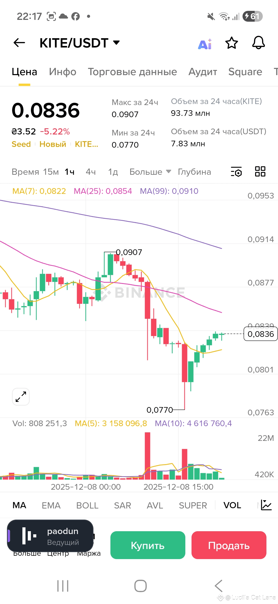 Лежу перед сном, решила последний раз глянуть на рынок перед тем как вырубить телефон, открываю $KITE от @GoKiteAI, а там минус 5.22%, цена 0.0836 после жесткого падения с 0.0907 до 0.0770. И думаю: блин, надо было продавать когда было выше девяти центов, но нет же, жадность победила здравый смысл. Хотя если честно, даже на текущей цене я все еще в плюсе от точки входа, так что не так все страшно как кажется. Объем торгов 93.73 миллиона по KITE — это вообще огромная цифра, показывает что актив ликвидный и интерес к нему реальный.