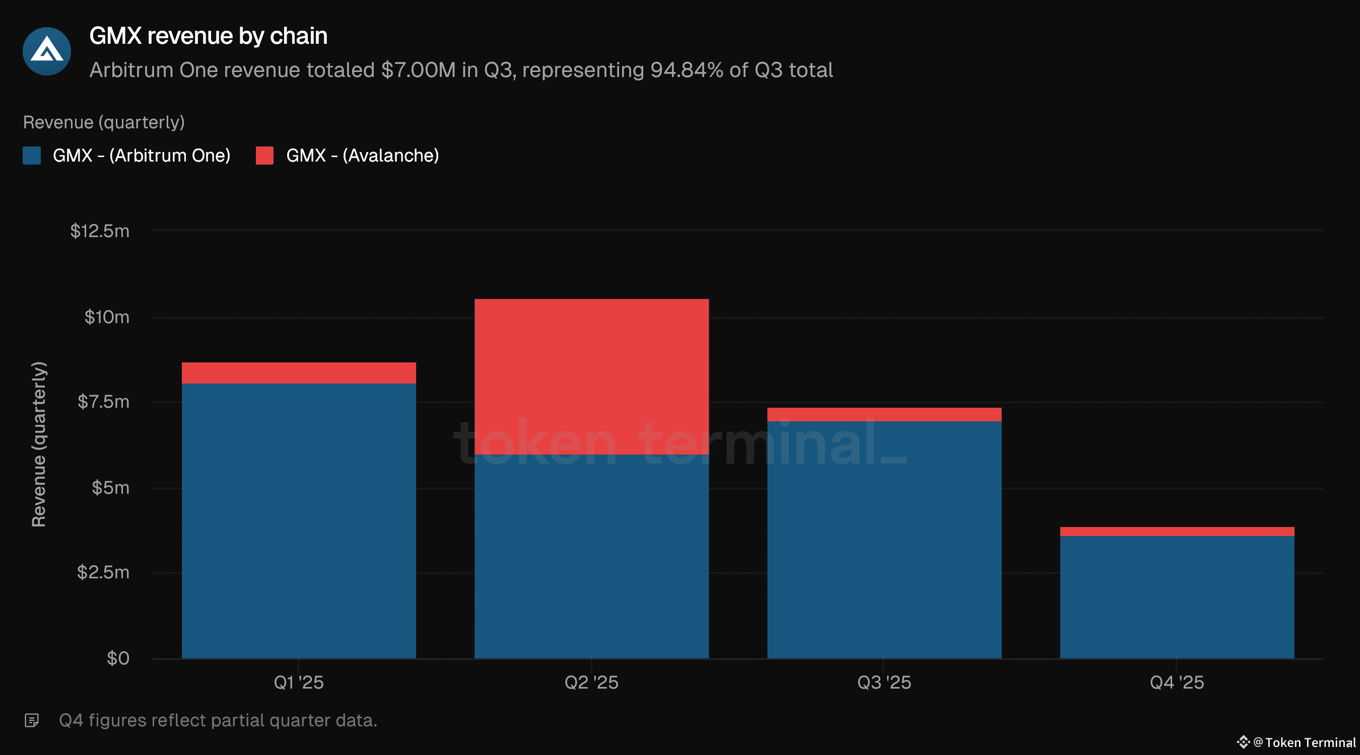 Revenue measures the total USD value of trading fees retained by GMX. Q3 revenue totaled $7.38M, down from $10.55M in Q2. Arbitrum One accounted for $7.00M, while Avalanche contributed $0.38M.
