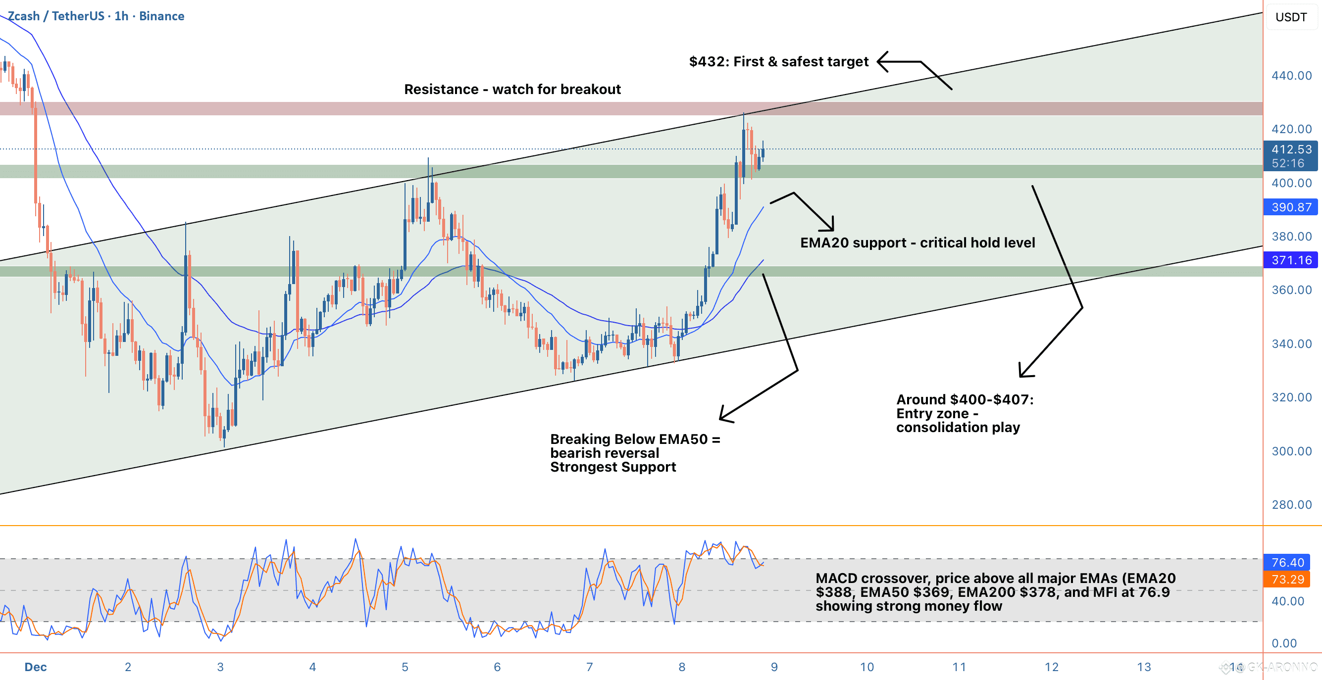 Hey guys, ZEC is consolidating after an explosive +17.32% rally that took price from $332 to $425 in 24 hours. Now trading at $407.75, we're watching to see if bulls can digest these gains and push for another leg or if we're due for a retracement.