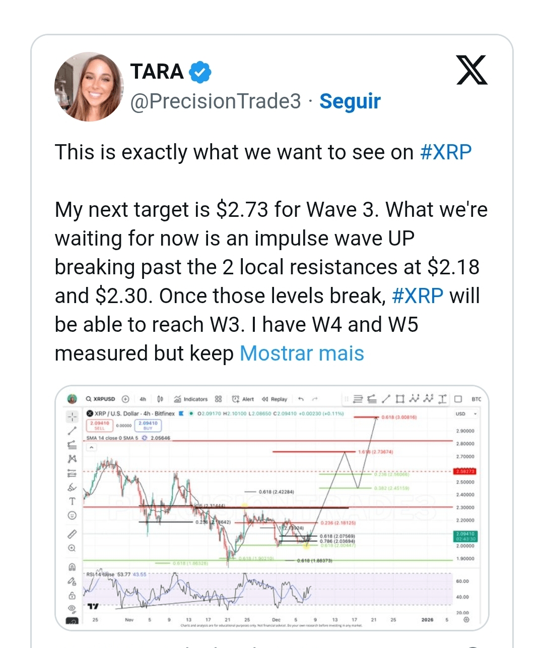 Tara's analysis provides a clear structure for traders tracking XRP's next movement. The chart highlights support at $2.07 and resistance at $2.18 and $2.30. A breakout of these barriers paves the way for $2.73.