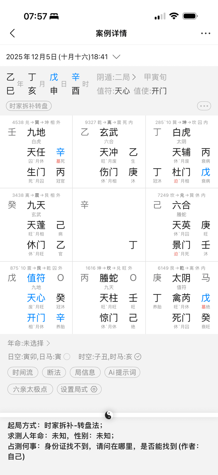 I searched all around the house but couldn't find it, so I set up a Qimen Dunjia session to ask where my ID card is. Can it be found? The hexagram is as shown in the picture.
