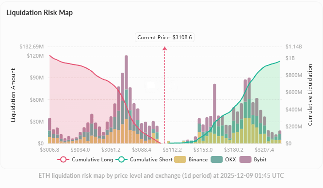 The 24-hour liquidation amount reached $51.35 million, with short liquidations of $29.77 million exceeding long liquidations of $21.58 million, confirming a bullish liquidation bias. The options open interest is $10.89 billion (up 0.46%), with Deribit accounting for 68.59%, and trading volume surged by 34.44%, focusing on the $3,100 major pain point. The liquidation heatmap shows a cumulative long exposure of $1.03 billion at $3,007, with a downward chain liquidation risk; above, there is only a small short liquidation resistance of $3.36 million between $3,109 and $3,112.