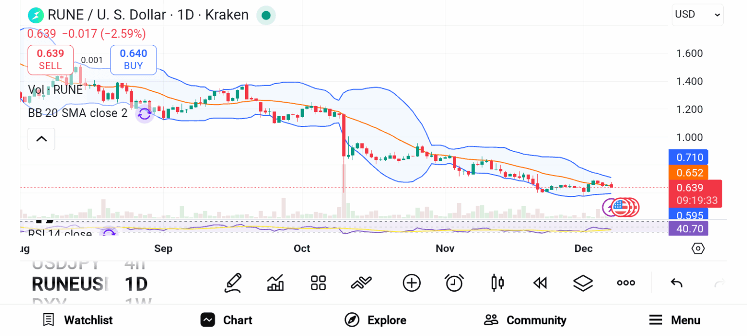 A key signal appears on the chart where the "Parabolic SAR" indicator is now below the candles. This position supports an active bullish trend that could push RUNE towards $0.717 or even $0.765. A breakout above the $0.687 area could confirm stronger momentum. Weak sentiment may send RUNE towards $0.644, so stronger buying pressure remains important.