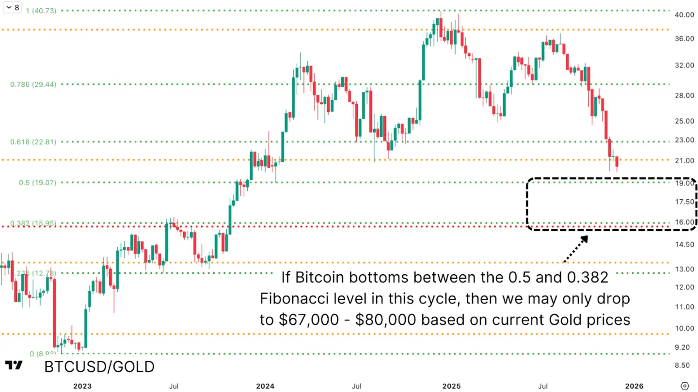 Measured against assets like gold, Bitcoin's purchasing power has been declining since December 2024, and the bear market has lasted far longer than analysis based solely on dollar-denominated prices suggests. Cross-period Fibonacci retracement levels, converted to USD, indicate strong support in the $67,000-$80,000 range. While this analysis is theoretical and actual price action may not perfectly align, the convergence of data across multiple timeframes and valuation frameworks suggests that the bear market may end sooner than the market anticipates.