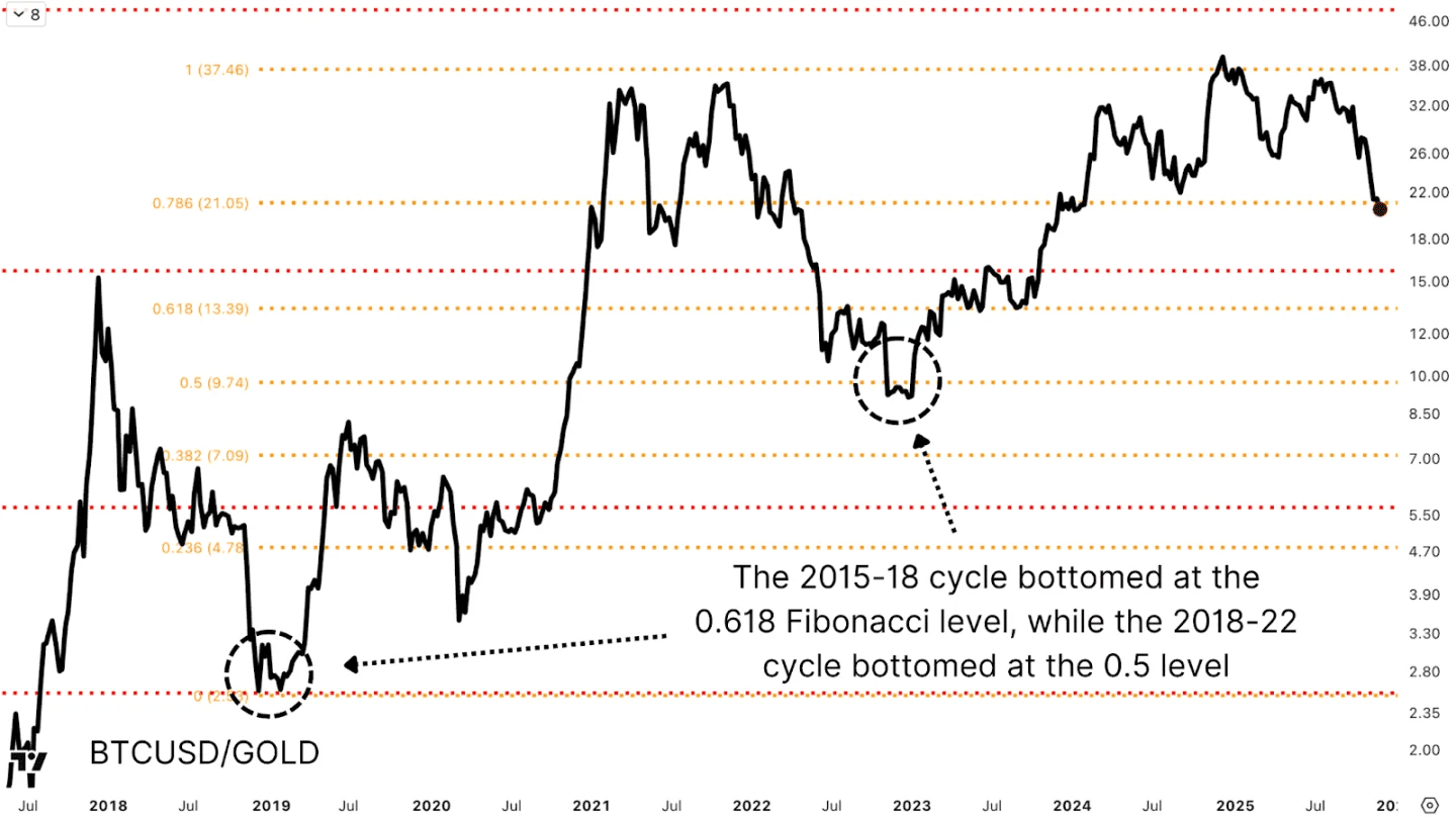 The bottom of the 2015-2018 cycle fell within the 0.618 range, corresponding to approximately 2.56 ounces of gold per Bitcoin.