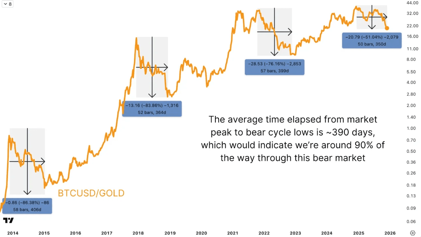 Recently, several analysts have found that if you measure Bitcoin not by the dollar but by the purchasing power of gold, you can gain a more comprehensive understanding of the current market cycle. — Perhaps this bear market has already entered the countdown phase.