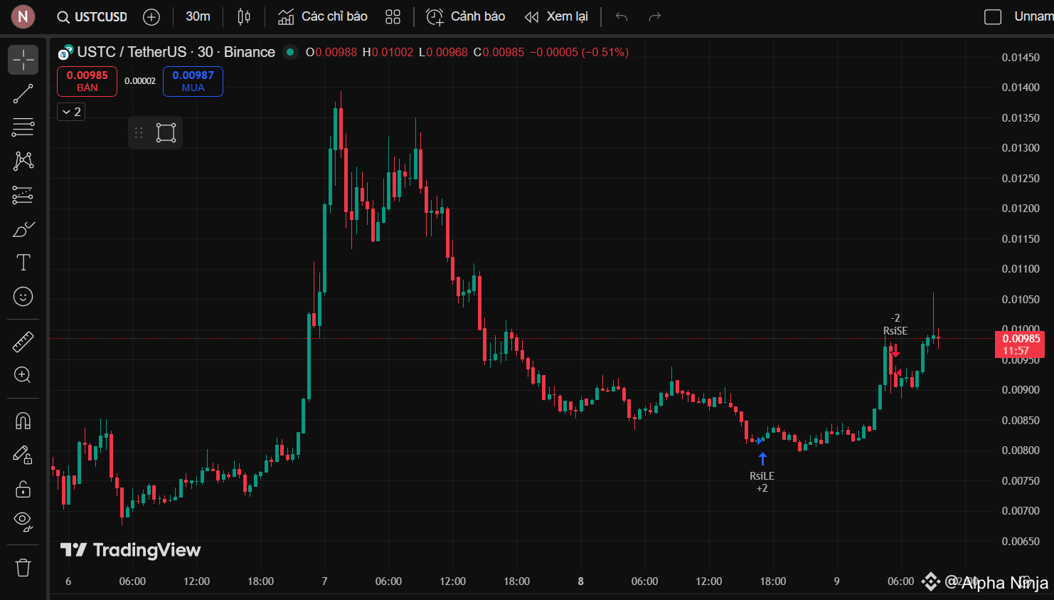 USTC suốt hai ngày trước gần như chết sóng, nhưng cú đẩy từ vùng 0.0078 lên sát 0.01 vừa rồi lại không hề bình thường. Lực mua xuất hiện đúng lúc thanh khoản mỏng, giống kiểu test cung của cá voi từng đánh USTC các đợt trước. Đáng chú ý nhất là cụm nến nhấn mạnh ngay sau tín hiệu RsiLE, cho thấy có ai đó đang che lệnh và không muốn lộ volume.