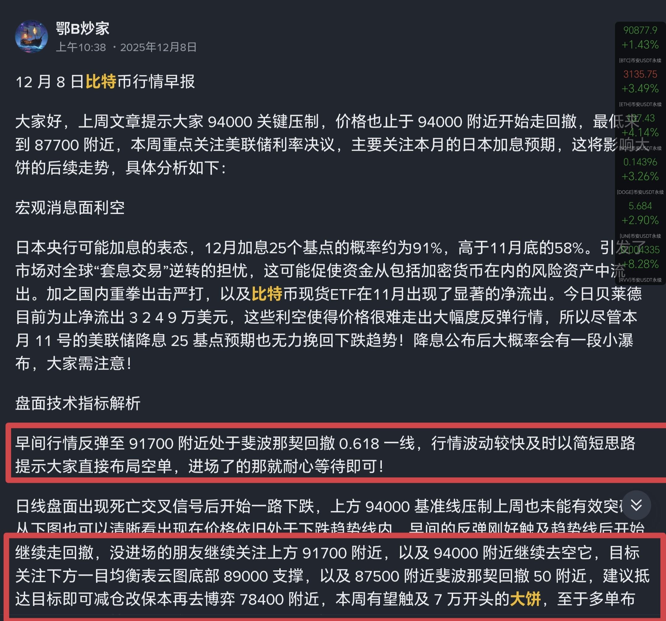 As the new week begins, the Bitcoin market remains shrouded in cautious sentiment. Although last Friday (December 5), the spot ETF recorded a net inflow at one point, the overall momentum is weak, and the price has failed to effectively break through. Currently, Bitcoin is fluctuating around $90,000, having retraced nearly 30% from the historical high in October. Before the Federal Reserve's significant interest rate decision is announced tomorrow (December 10), prudent friends choose to sit tight.