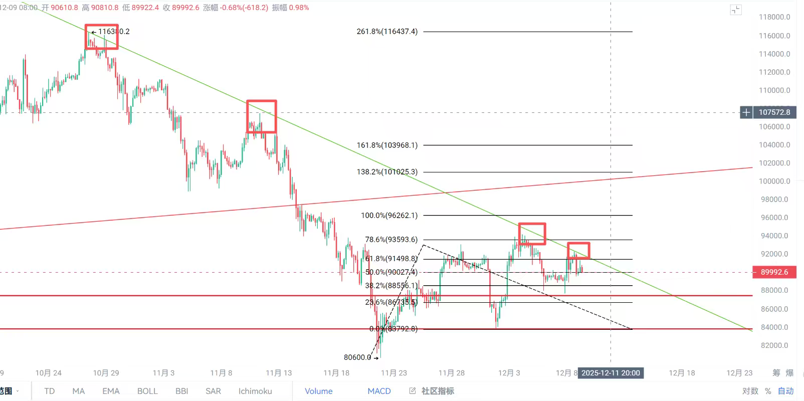 For holders: The short position entered near $91,700 yesterday has been reduced near $90,000; the remaining position can continue to be held, with the stop loss moved up to near the entry price. The ultimate target can still be seen at the $83,800-$80,600 area, or even the mid-term structure level of $78,500.