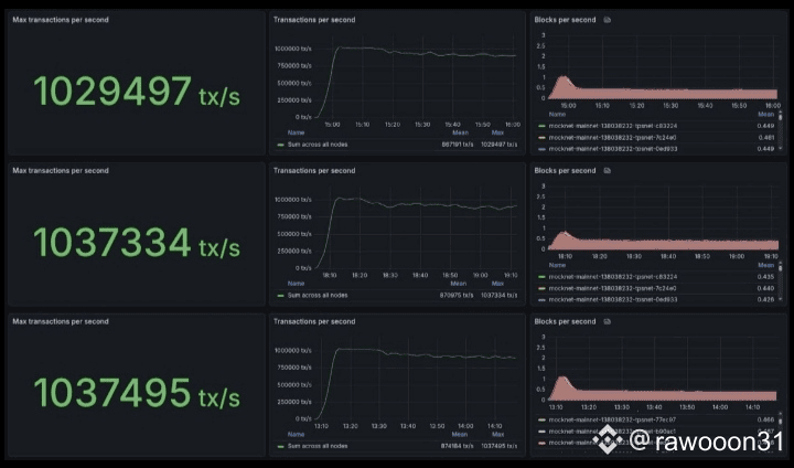 The results are available in three Grafana dashboards that peaked at 1,029,497, 1,037,334, and 1,037,495 transactions per second, followed by consistent performance of one million TPS for nearly an hour each.