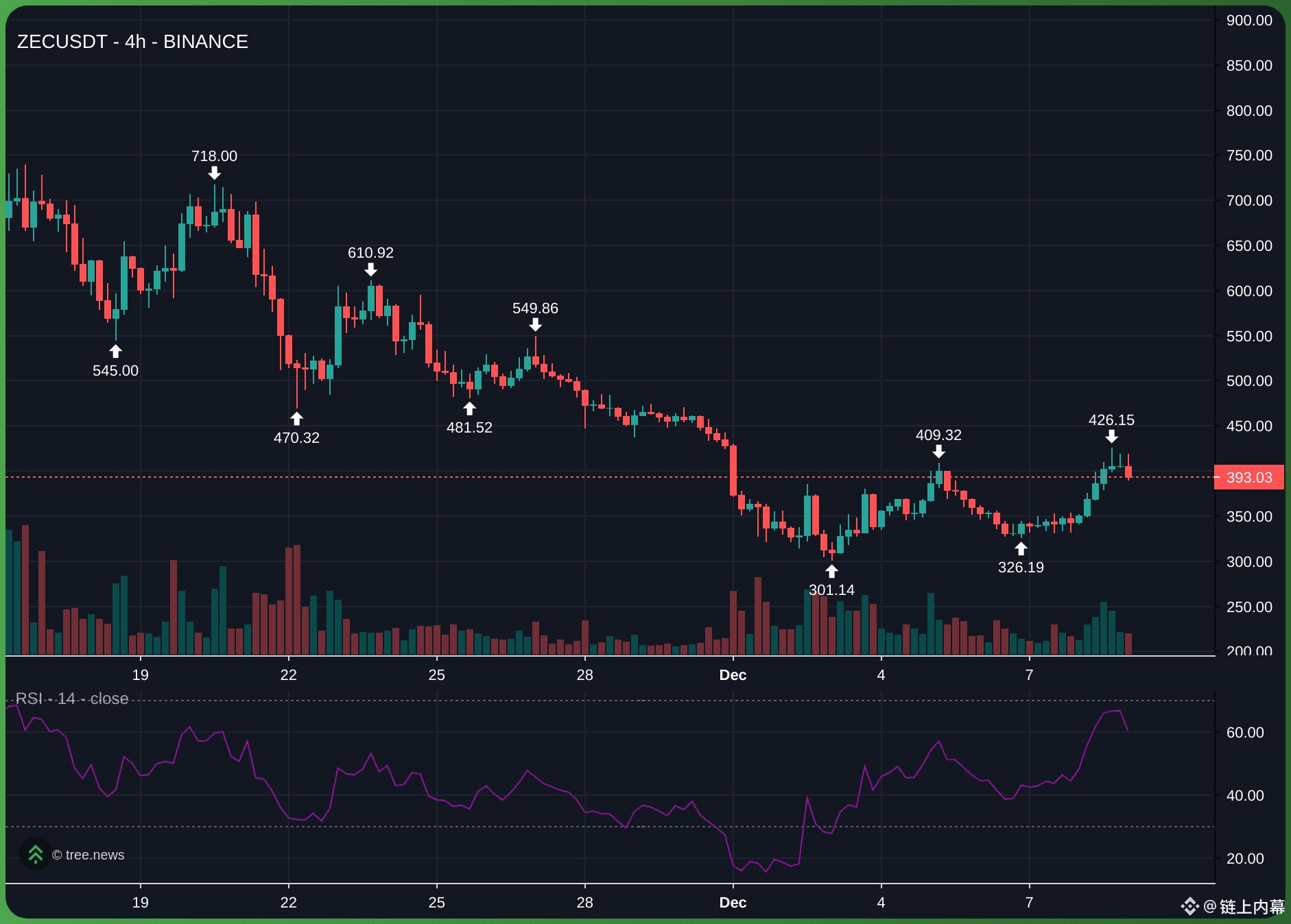 1. Volume Analysis: Recent 4h candles show declining volume during advance potential bearish divergence. Last meaningful volume surge occurred during the rally to $425.