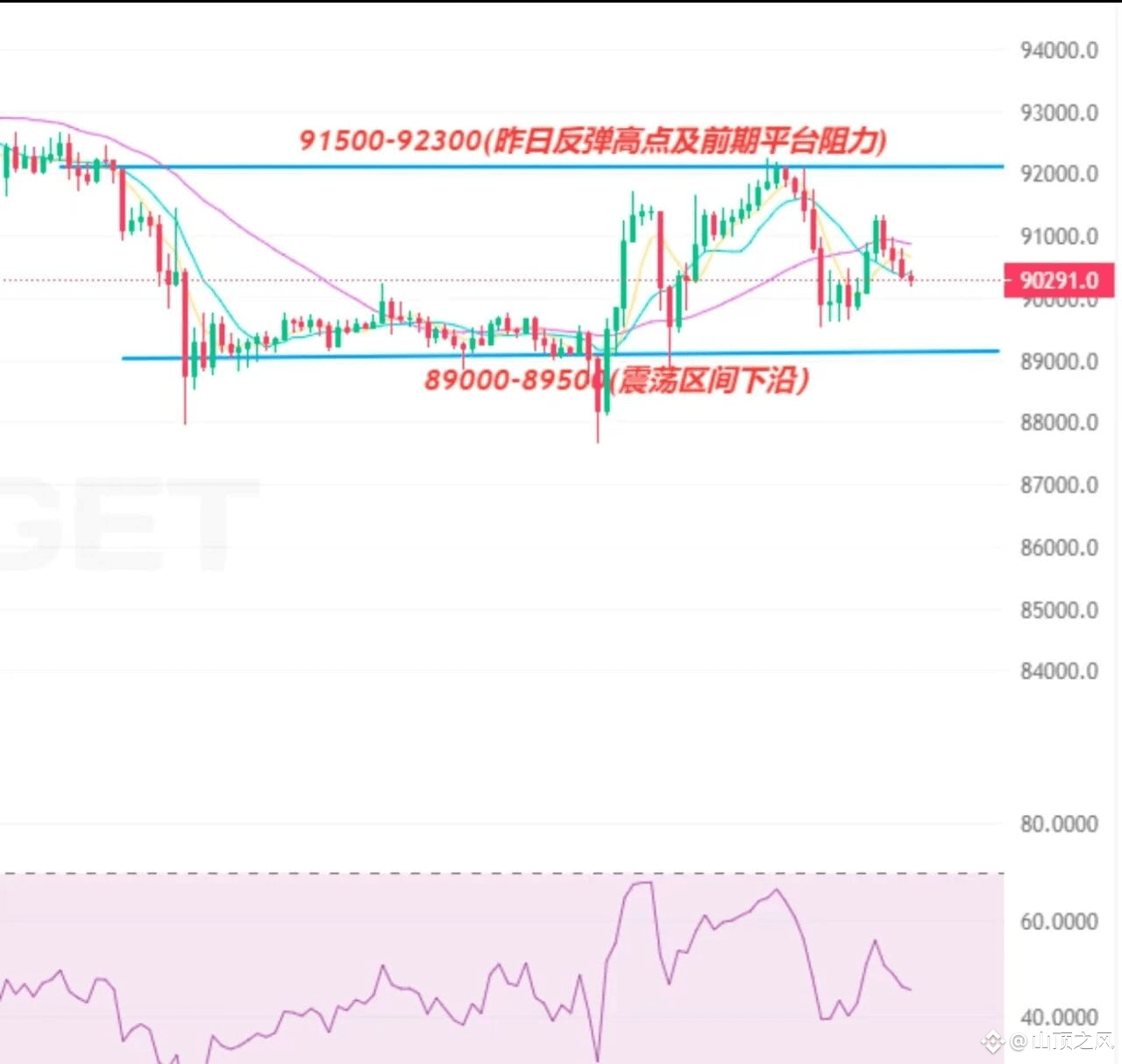空头策略:若价格反弹至92,000-92,500美元阻力区出现滞涨,可轻仓尝试做空,目标回看91,000-90,500美元。