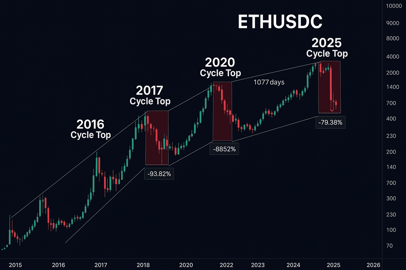 The image clearly shows the monthly evolution of the ETH/USDC price from 2015 to 2025, highlighting the main Cycle Tops, their subsequent crashes, and long-term growth channels.