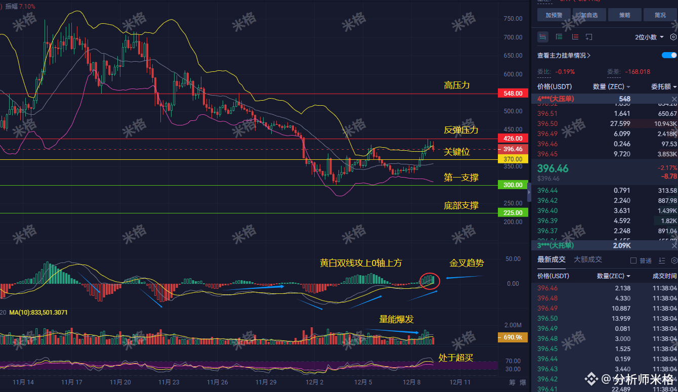 刚才翻行情,ZEC的四小时图直接把我盯精神了——黄白线双双冲上0轴上方,金叉开口,量能还在爆,这明显是多头在发力啊!