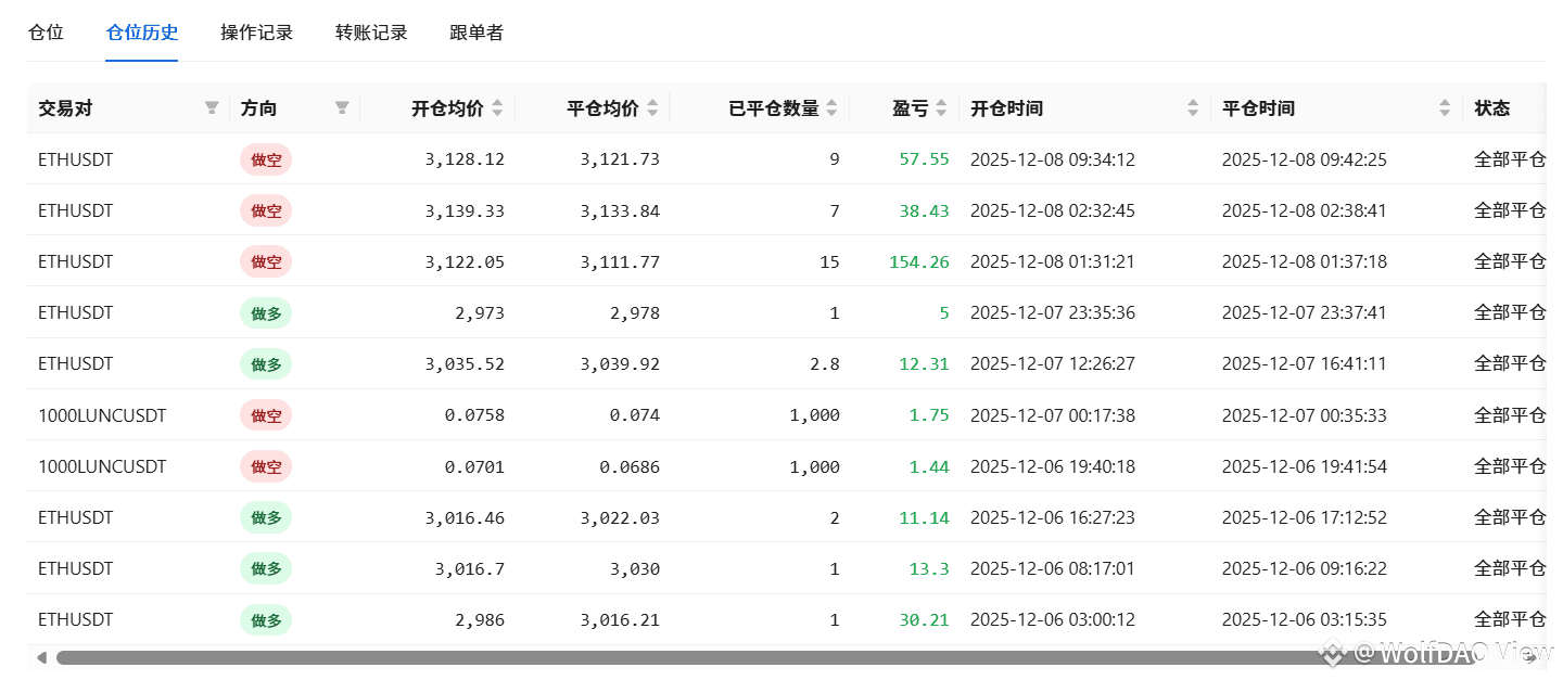 快速止盈成常态:大量订单持仓数分钟即平仓,例如 12 月 7 日 ETHUSDT 多单持仓 2 分钟盈利 5 USDT,11 月 22 日 ETHUSDT 多单持仓 2 分 15 秒盈利 50.78 USDT;