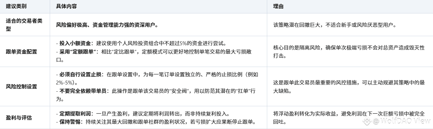 不适配人群:新手、保守型投资者、追求稳定收益者;资金量过小(<3,000 USDT),难以承受滑点与极端亏损;无法接受 “赚小钱、亏大钱” 模式者。