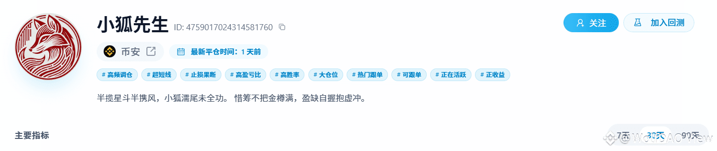 带单员 “小狐先生” 的公开数据堪称 “魔幻”:180 天 ROI 42.44%、名义胜率高达99.63%(1634 笔交易仅 15 笔亏损)、多空策略均衡(多头 812 次 / 空头 822 次),标签看似完美;但核心警示信号同样刺眼 —— 跟单社区总盈亏 -28,767.73 USDT,带单员自身盈利 4.49 万 USDT,跟单者却集体亏损。这种 “高胜率≠高跟单盈利” 的矛盾,源于其高频短线策略的核心缺陷,需理性拆解后再决策。