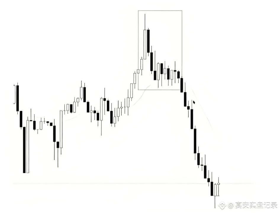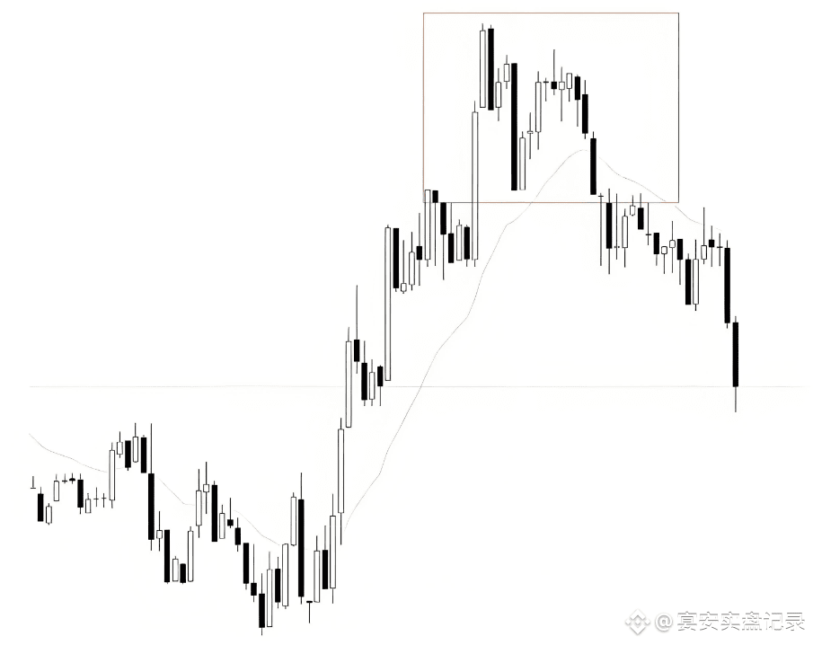 接下来,市场开始出现一些逆势 K 线,并且 K 线之间的重叠逐渐增多。这标志着市场从一个急速上升的阶段转变为一个 上升通道 。在这个通道的末期,价格重叠的现象进一步增加,行情逐渐转变为 横向交易区间 ,K 线几乎都在重叠,显示出市场的双边交易特征。