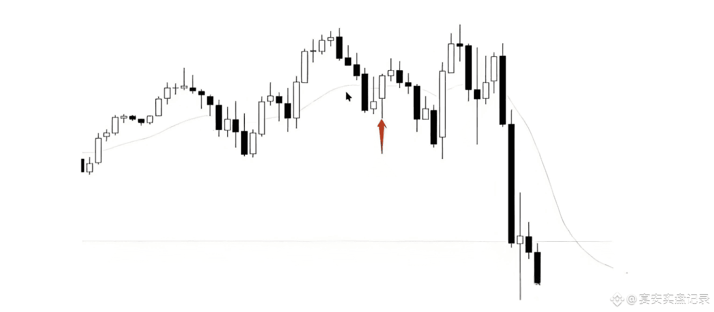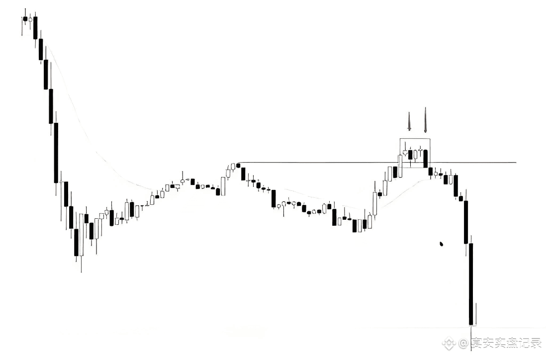 第二根 K 线:箭头标注的第二根 K 线再次跌破前一根 K 线低点,形成二次突破信号。