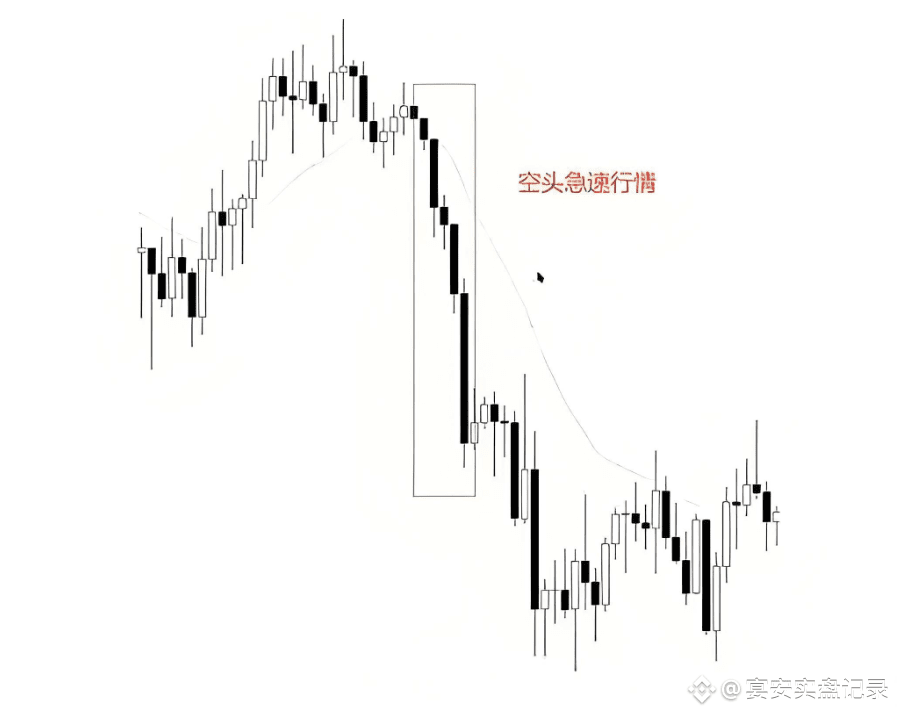 连续不重叠的同方向趋势 K 线,就是急速行情。这代表趋势运动能量强劲,在这一段市场中,多空某一方完全控制了市场,之后一般都会有跟进动作。
