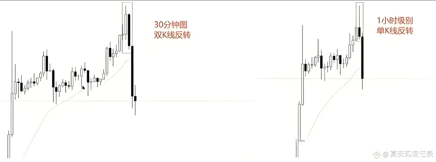 小周期的双 K 线反转实际上是大周期的单 K 线反转。我们可以看图左边,左边展示的是 30 分钟图上的双 K 线反转形态。如果我们将 K 线周期放大到一小时,那么它就变成了一个单 K 线反转形态。