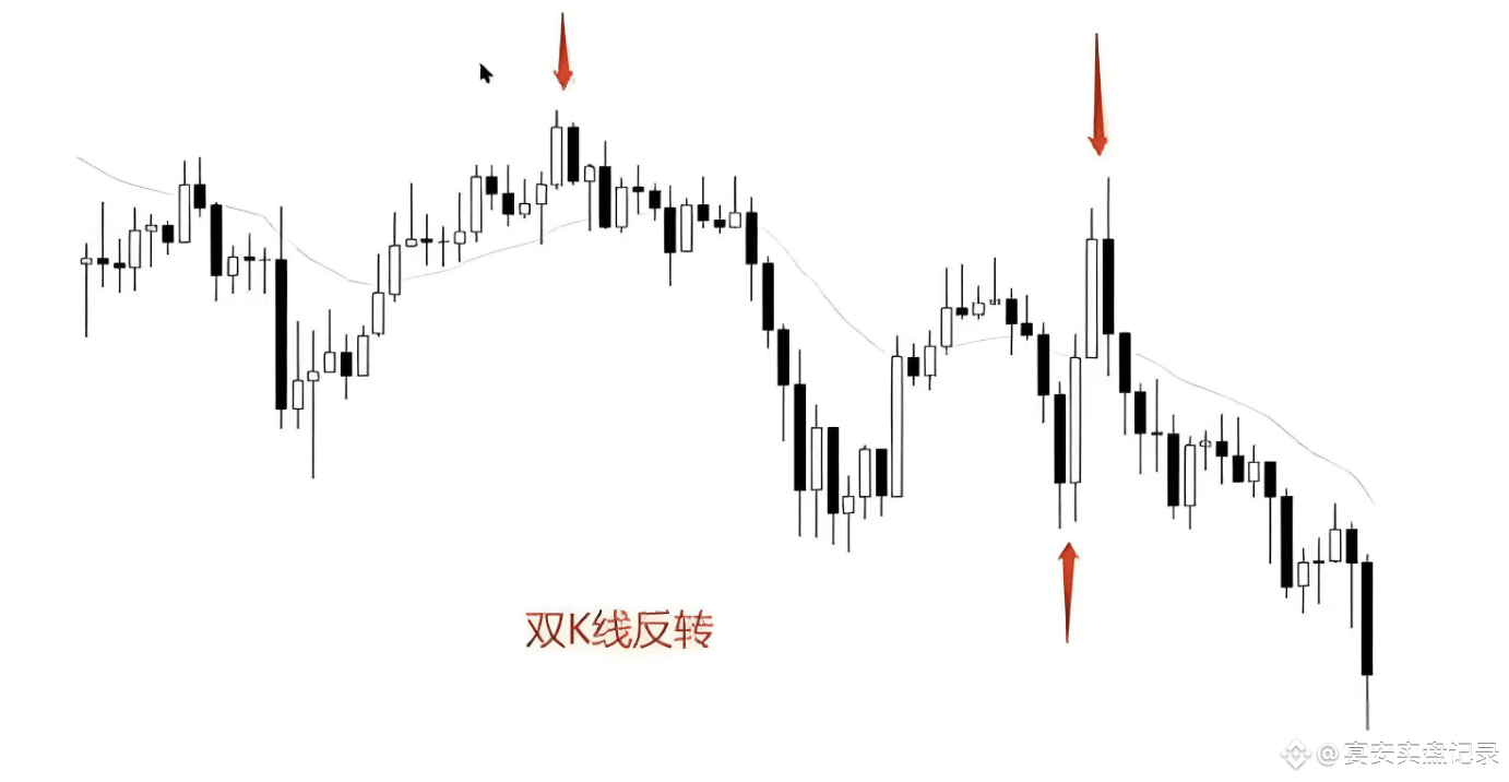 双 K 线反转是指两根连续的趋势 K 线,它们的长度大致相等,但方向相反。双 K 线反转是最常见的反转建仓形态之一,因此非常重要。