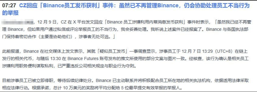 Today, CZ and Binance officials provided a final explanation regarding the 'employee issuing tokens for profit' issue. In short, there are three points: 1. People have been arrested, and the crime has been established (suspended and handed over to law enforcement); 2. Rewards have been issued ($100,000 reward to the whistleblower); 3. Attitude is firm (CZ personally stepped in to declare a strict investigation).