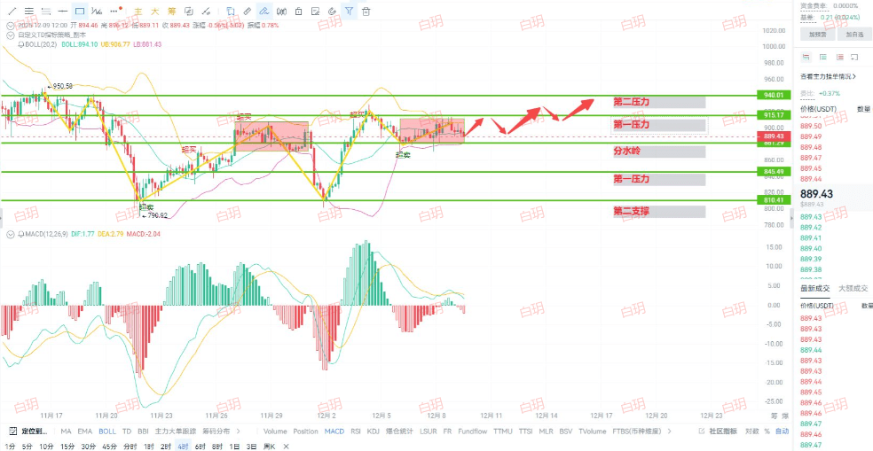 From the chart, we can see that we are currently in a standard 'sandwich market'. Above, $915 to $940 is heavy resistance. Below, $845 and $810 are layers of support. The most critical point is the 'watershed' at 889.43; standing above it provides a chance to challenge resistance; if we miss it, we may seek support downward.