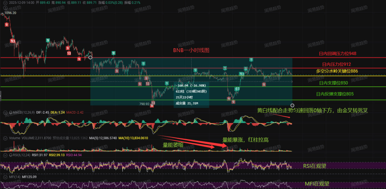 Looking at the hourly chart, the pressure is clear: 912 is the intraday pressure, and 948 is strong resistance on the pullback. But right now, it can't even hold 890, with MACD crossing down, RSI weakly fluctuating below 50, and volume still shrinking - this is a typical downward continuation! The key level below is 886 (the dividing line between bulls and bears); if it breaks, it will test 850, or even 805!