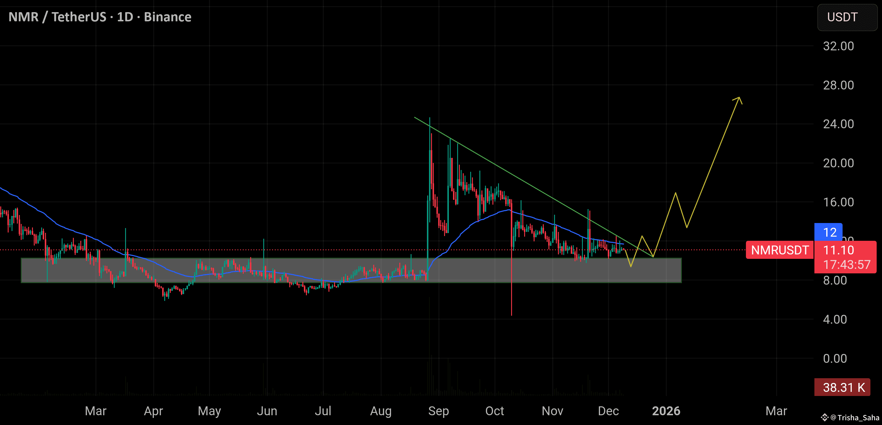 NMR is sitting right on its demand zone and the chart looks primed for a breakout. Price has held this accumulation range for months, and the downtrend line has been losing strength with every retest. If buyers protect this zone and we get a push through the trend line, a break and hold above 12.5 becomes the real trigger. Clear that level and the move toward 22 to 25 can unfold quickly. This setup only needs one strong impulse to flip the entire narrative.