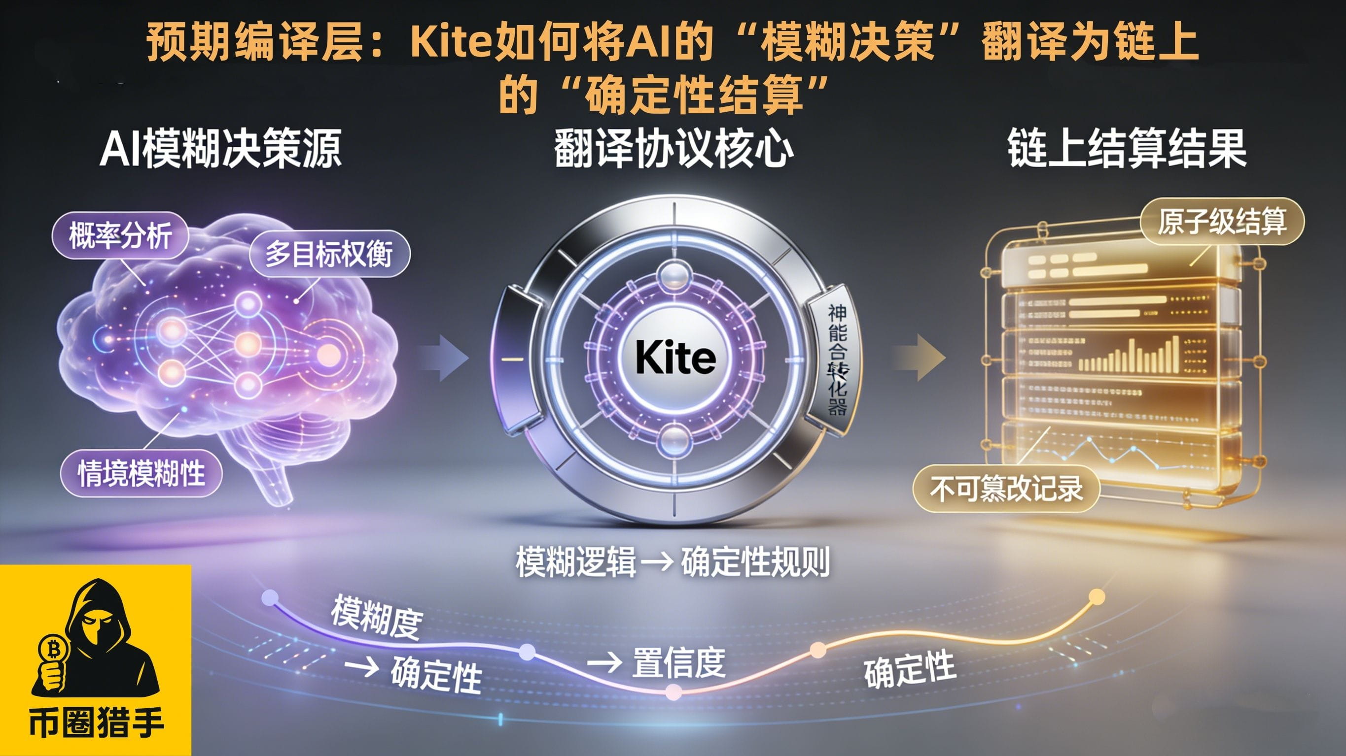 What Kite AI is building is an 'expected compilation layer' bridging probabilistic AI and deterministic blockchain. Its core function is not to enable AI to trade faster, but to compile, verify, and encapsulate AI's inherent, vague, probabilistic 'intentions' and 'expectations' into 'deterministic commitment packages' that the blockchain can natively understand and execute through a rule engine (programmable governance) and consensus mechanism (PoAI). The average daily 1.01 million interactions among agents in its network essentially complete 1.01 million compilations and executions from 'vague expectations' to 'deterministic settlements'. Understanding Kite means understanding how it solves the 'last mile' problem of AI economy on-chain—not data transmission, but the bridging of 'decision logic' and 'settlement logic'.