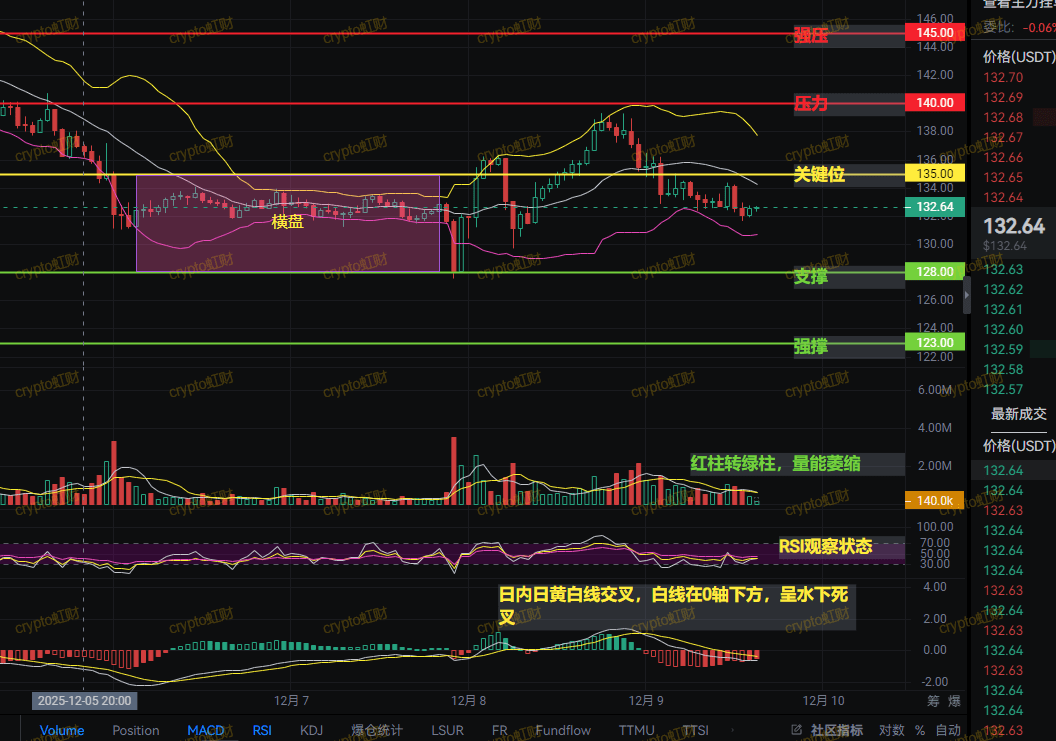 I believe that the difficulty of a direct violent surge to break through 135 today is relatively high. The more likely scenario is: first, a pullback to test the support in the 128-130 range. If it can stabilize here, and after a decrease in volume, it expands again, then there is hope to restart the rebound and challenge 135 again. After breaking 135, the next target will be the 140-145 pressure zone. In simple terms: hold above 128, and there is still a chance.