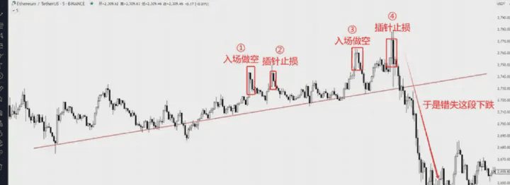 It’s not always like that. For example, let’s look at this case: in the context of a downturn, Zhang San decided to short this upward reversal when a strong top pattern appeared at position 1. Later, the market didn’t fall, and he hit his stop loss at position 2. Later, at position 3, the price gave him another chance, and Zhang San chose to enter again. But unexpectedly, at position 4, the price spiked again, hitting his stop loss. Although there was a chance to revenge-enter at position 4, Zhang San was hesitant after stopping out twice, and as a result, when the market fell sharply afterward, he missed the opportunity. Zhang San found himself crying and cursing the heavens and the market.