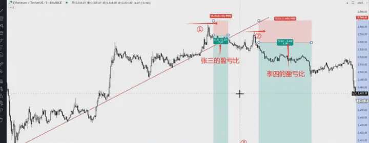 Zhang San entered at position 1 and profited at position 3, while Li Si entered at position 2 and also profited at position 3. However, it is clear that their earnings were not the same. Zhang San made 5.8%, while Li Si only made 5.5%. If Li Si had been a bit more conservative and had set his stop loss to match Zhang San's at position 1, Li Si's profit-loss ratio would only be 1:5, far lower than Zhang San's 1:8.