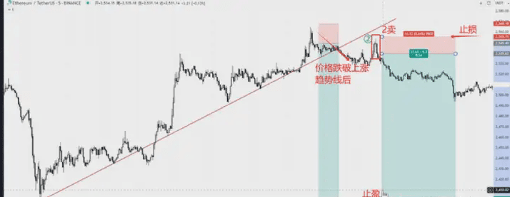 Similarly, if Li Si, when facing the current trade, firmly adheres to 'as long as the price does not break this upward trend line,' or says 'as long as there’s no signal for selling at 2 or 3,' he will resolutely not enter. Therefore, he will patiently wait for the price to break down through the upward trend line, and then enter a short position at position 2, which is the sell signal at 2. The stop loss would be at the top of the top pattern, and the take profit at the previous low. We can say that Li Si's strategy is right-side. We can see that the market subsequently also hit the take profit.