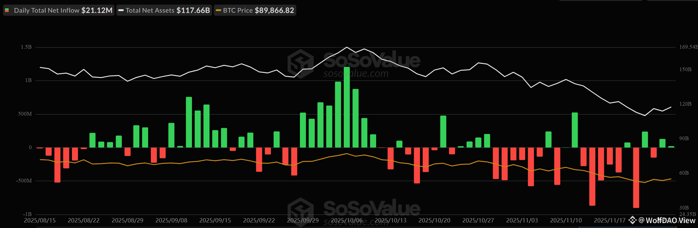 要理解山寨币ETF的表现,我们必须把它们放在更广阔的市场背景中来看。2025年11月,对于比特币和以太坊ETF来说,是自2024年1月上市以来最糟糕的一个月。11只比特币现货ETF在11月累计净流出35-37.9亿美元,但更可怕的是流出的持续性:在11月的20个交易日中,有16天出现净流出,占比高达80%。