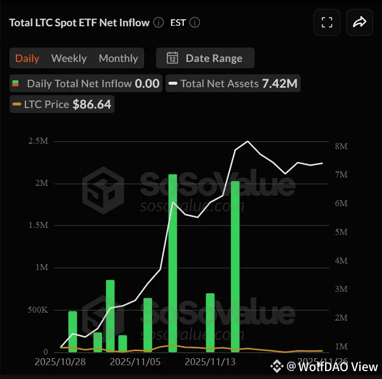 曾经的"数字白银"Litecoin遭市场抛弃。LTCC总资产仅742万,不到XRP首日3%,24h交易量仅267K。叙事缺失("更快比特币"已过时)、费率劣势(0.95%是BTC ETF的2-3倍)、流动性陷阱(AUM低导致价差扩大、机构远离)是LTC缺乏吸引力的主要原因。