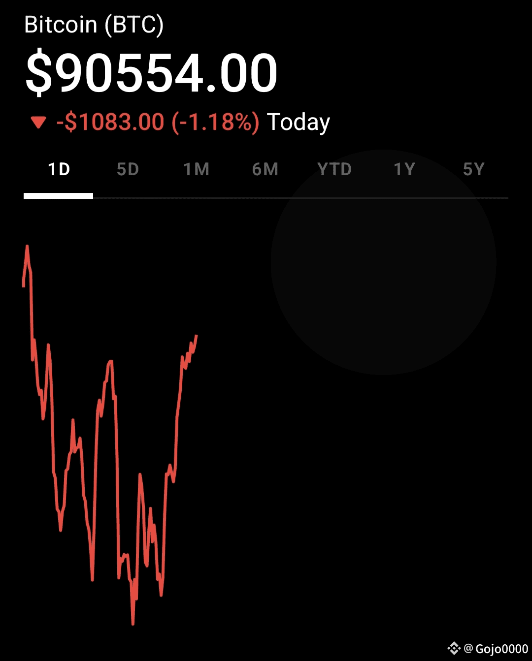 Bitcoin (BTC) — the largest crypto by market cap — is trading near USD 90,000–90,200, down roughly 1–2% over the past 24 hours.
