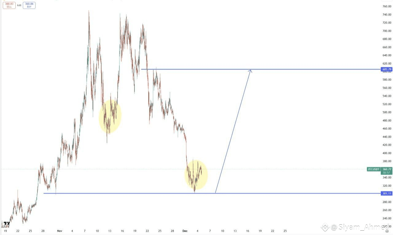 $ZEC has reached a major historical support level around $300, a zone that previously triggered powerful bullish rebounds. The chart shows a clear repetition of price behavior, where the market forms a bottom, consolidates, and then launches a strong upward move.