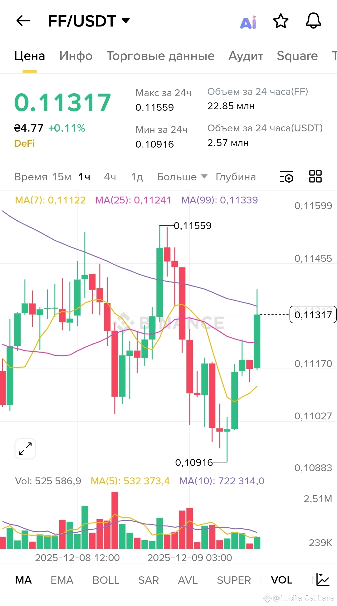 Вы знаете, что меня всегда завораживает в крипторынке? Моменты, когда находишь проект, который не кричит о себе на каждом углу, не заливает соцсети агрессивным маркетингом, но при этом делает что-то действительно интересное. Вот сижу я поздно вечером, листаю графики, и натыкаюсь на $FF. Цена 0.11317, небольшой плюс 0.11% за день - скромненько, без пампов и дампов. И это меня сразу заинтриговало.