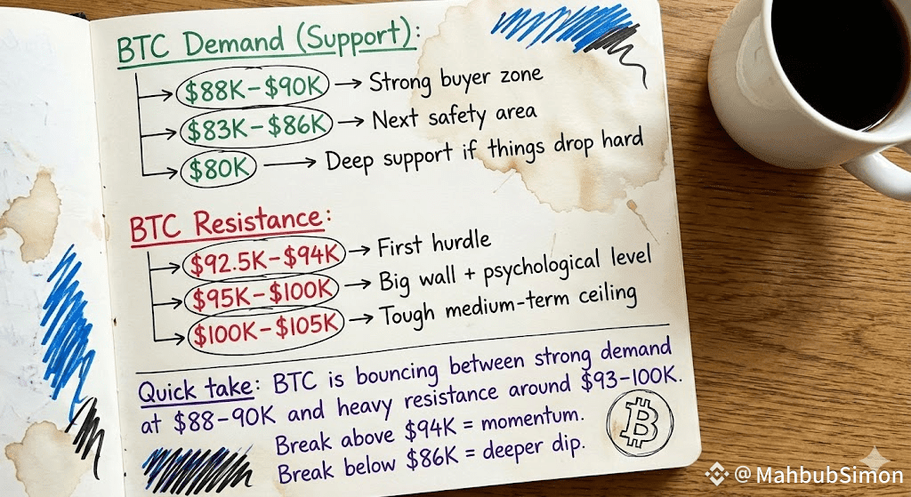 BTC is bouncing between strong demand at $88–90K and heavy resistance around $93–100K. Break above $94K = momentum. Break below $86K = deeper dip.