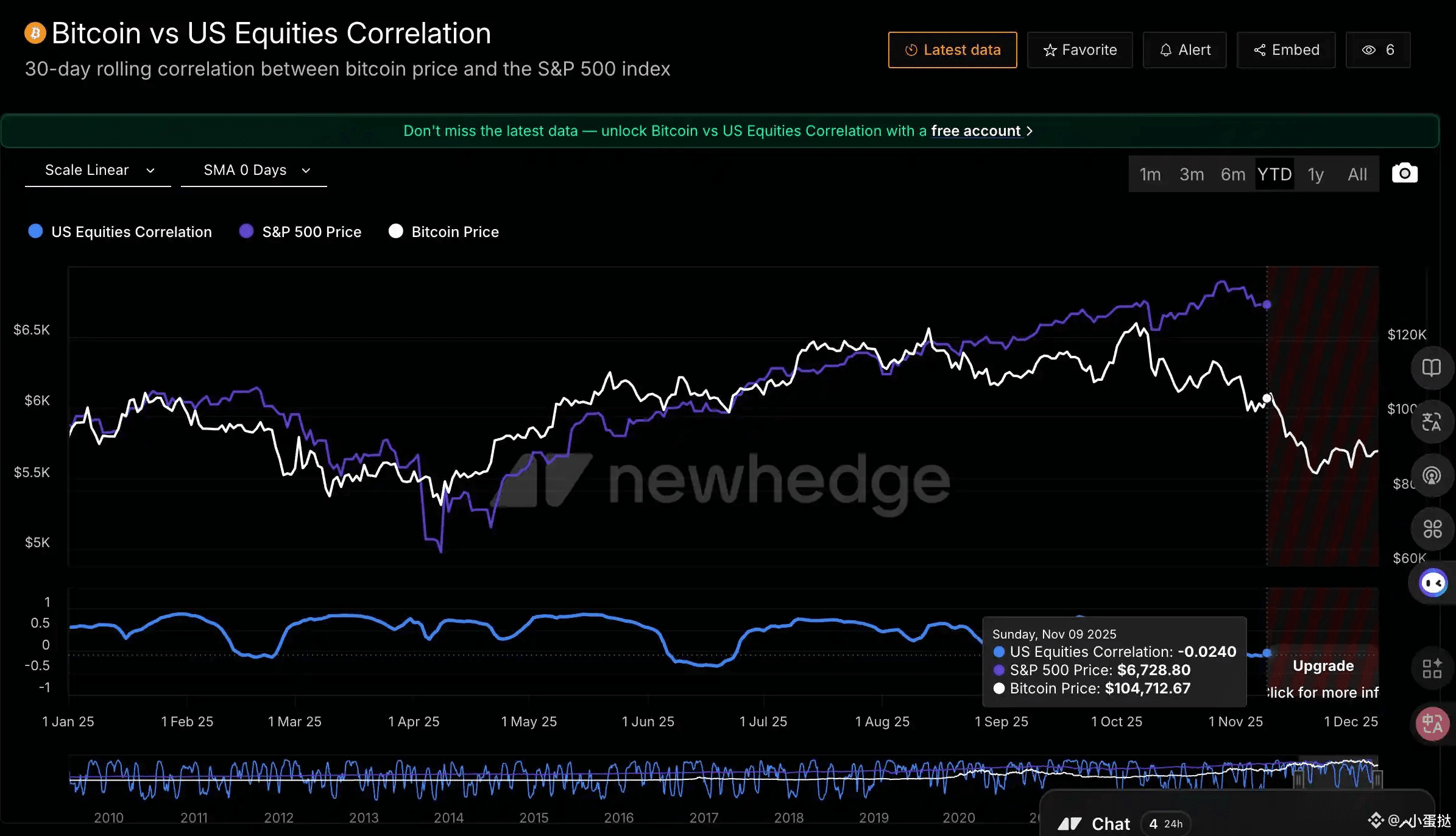 从实际联动性看,2020 年后 BTC 与纳斯达克 100 的相关性从接近 0 升至 0.4,部分时段超 0.7,更偏向 “风险资产” 属性。但近期二者相关性出现异动,过去 20 天已跌至 - 0.43,纳斯达克逼近历史高点的同时,BTC 较 10 月高点下跌 27%,呈现 “股市涨时滞涨、股市跌时超跌” 的负面偏斜。