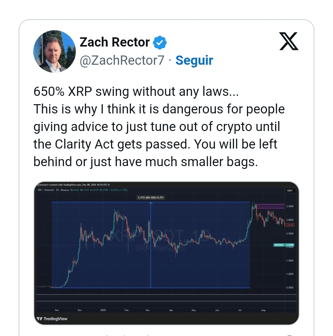 Zach Rector, the analyst behind the widely discussed publication, argues that the massive appreciation of XRP demonstrates what the market is capable of even without total regulatory certainty. His perspective highlights a deeper issue.