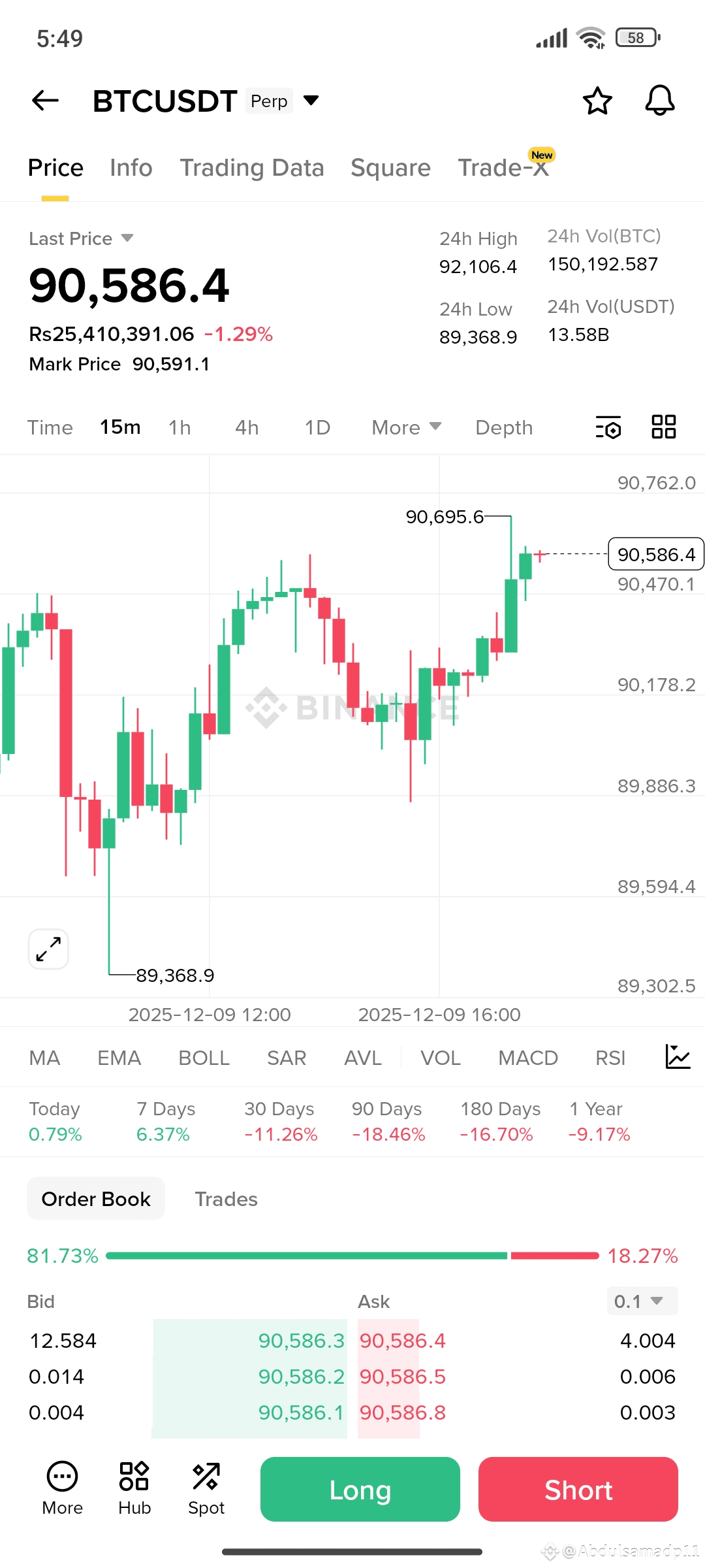 $BTC is heating up again! After touching the daily low near $89,368, BTC has bounced back strongly and is now trading around $90,500+. Buyers have clearly stepped in — and the chart is showing a clean reversal pattern.