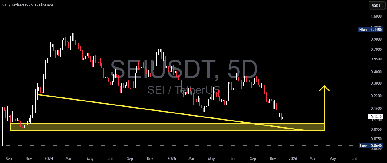 SEI is now approaching one of the most critical demand zones on the 5D chart: the 0.11–0.092 range.