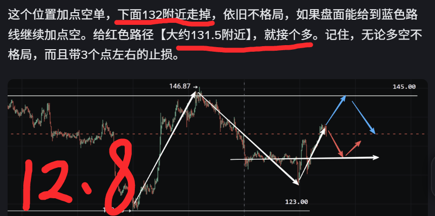 The market is currently following the red line analyzed yesterday, and is also rubbing near the white arrow (131.5). The market is too weak, and I won't take any long positions. Following a blue line, aim to short near 135.5-136.5, and long near 126. Regardless of long or short, set a stop loss of about 3 points.