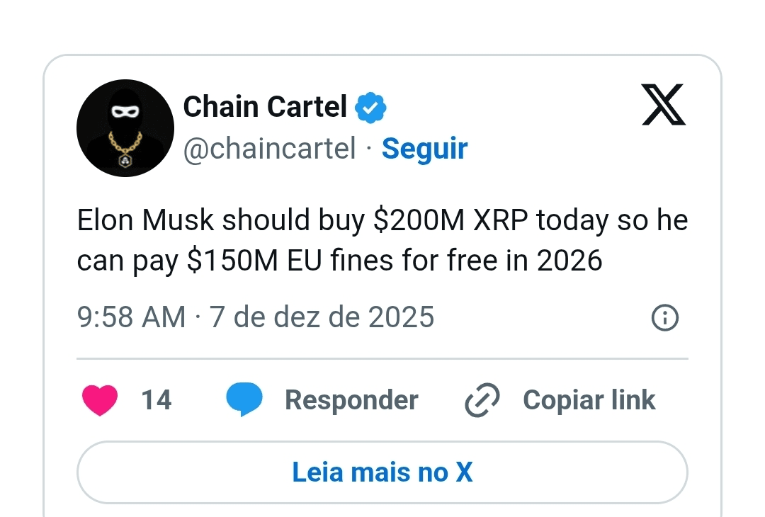 A recent post from the Chain Cartel (@chaincartel) on XRP presented a surprising proposal for Elon Musk related to XRP. The account wrote that "Elon Musk should buy $200 million in XRP today to be able to pay the EU's $150 million fines for free in 2026."