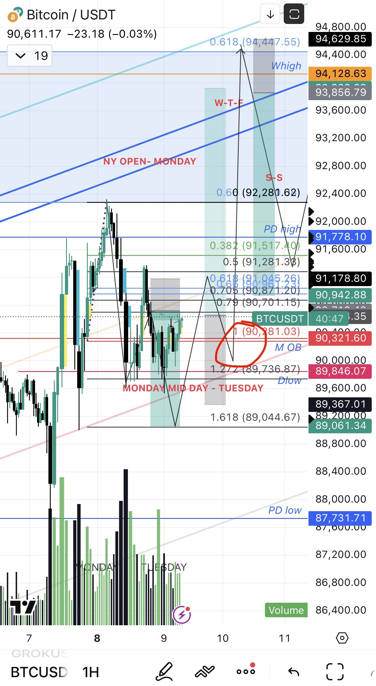 My personal view is that before FOMC tomorrow, there may be a pull-up to sweep 93,700, and even possibly sweep up to 95,700 because we have been making higher lows (Higher Low), and there’s no reason for me to think we should go down here.
