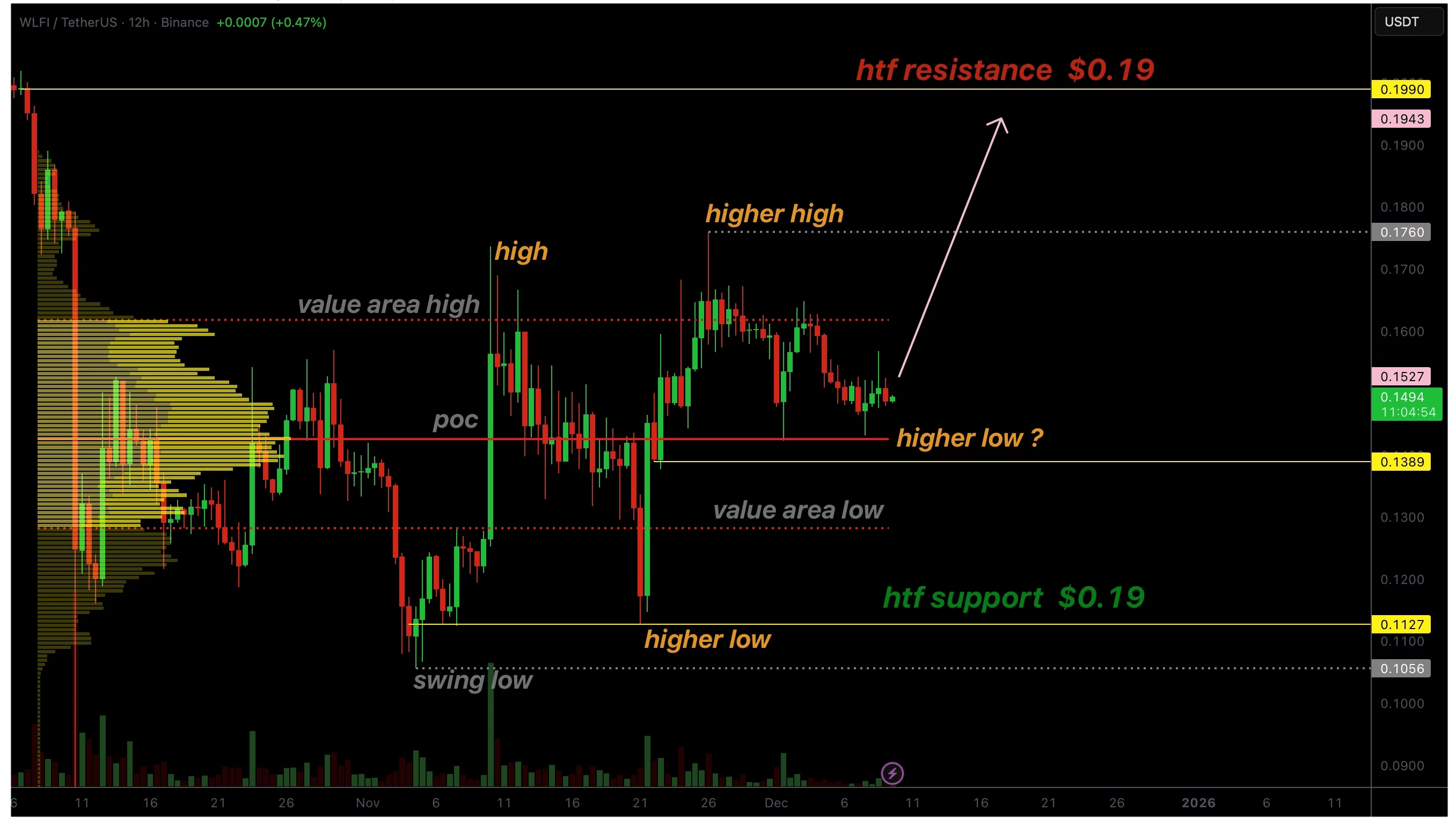 WLFI is moving within a clear positive structure shown by forming Higher Highs and Higher Lows, indicating buyers' control over the scene. The level of 0.06 (POC) has played a strong pivot point role that marked the start of the positive trend, before returning to form another important support at 0.13 🔷.